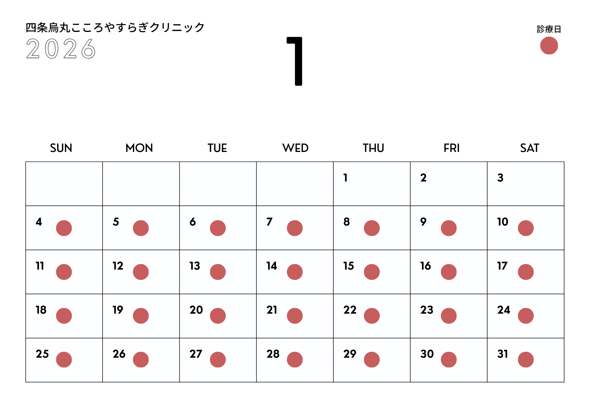 2026年1月の診療日について、ご案内申し上げます。